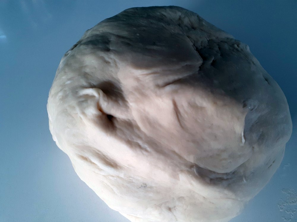 Kneed the dough for about ten minutes or untill it gains a smooth texture, adding flour as you go to stop it sticking excessively to your hands and the bench top. It's enough kneeding when you can poke your finger into the dough and it springs back.