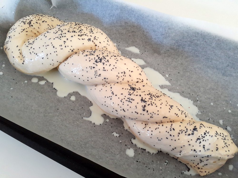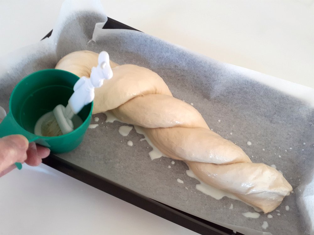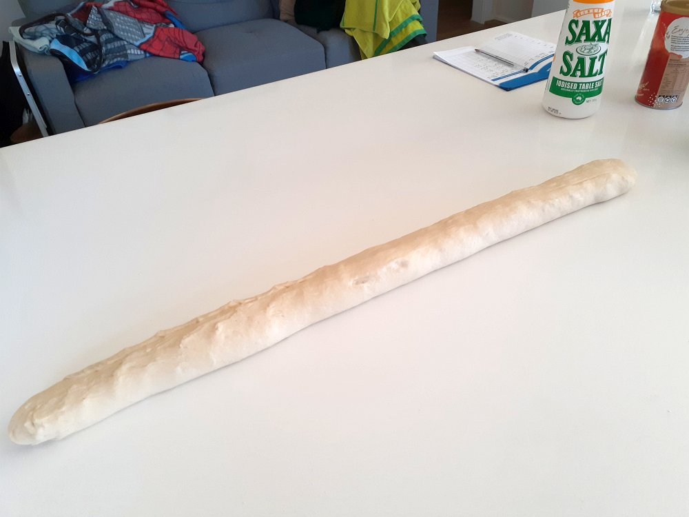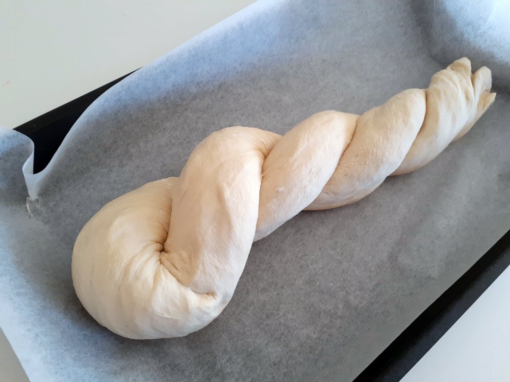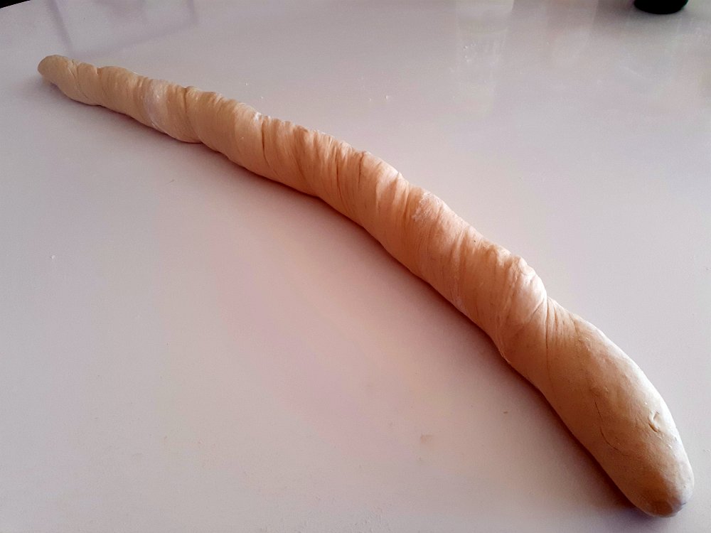 Roll the dough into a long sausage about twice the length of your baking tray. It should not be to thin or it will break when you lift it to it place on the baking tray.