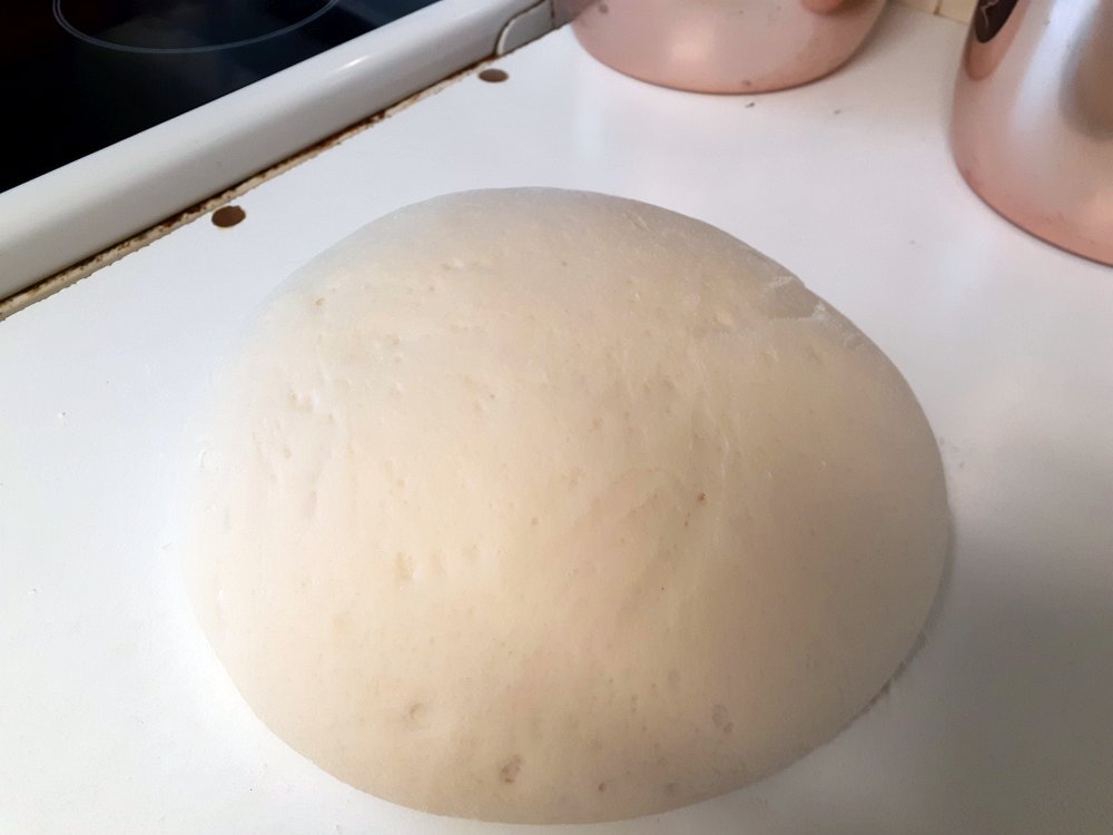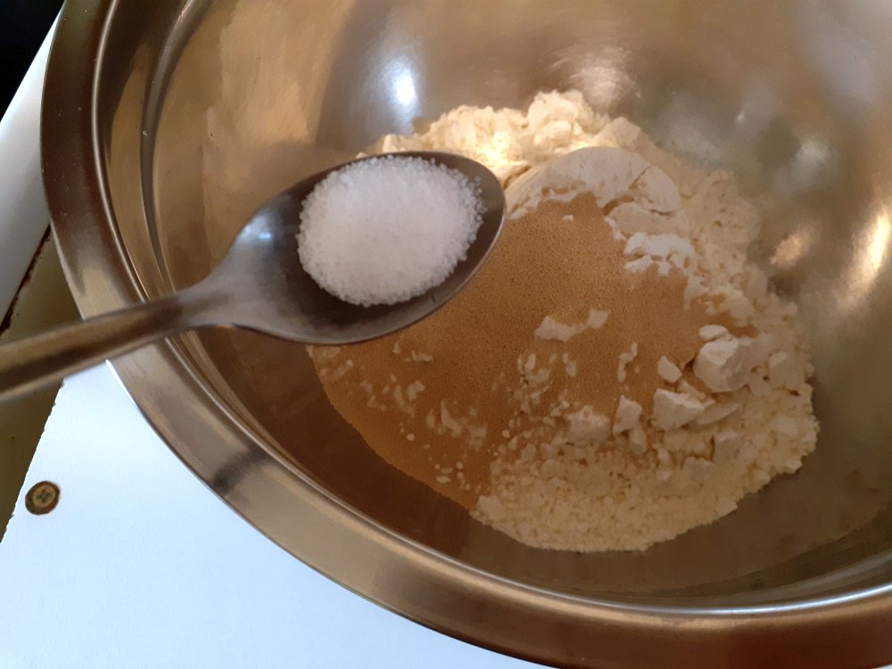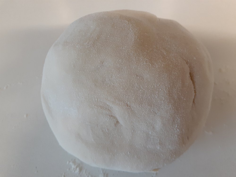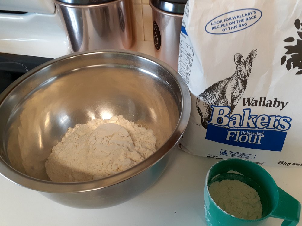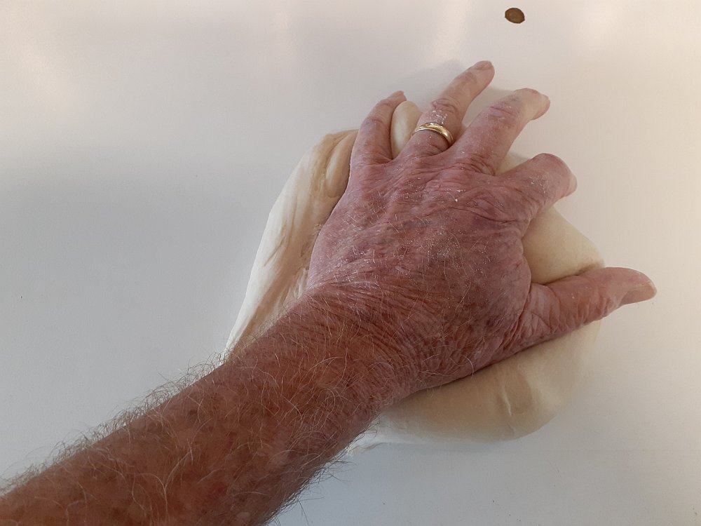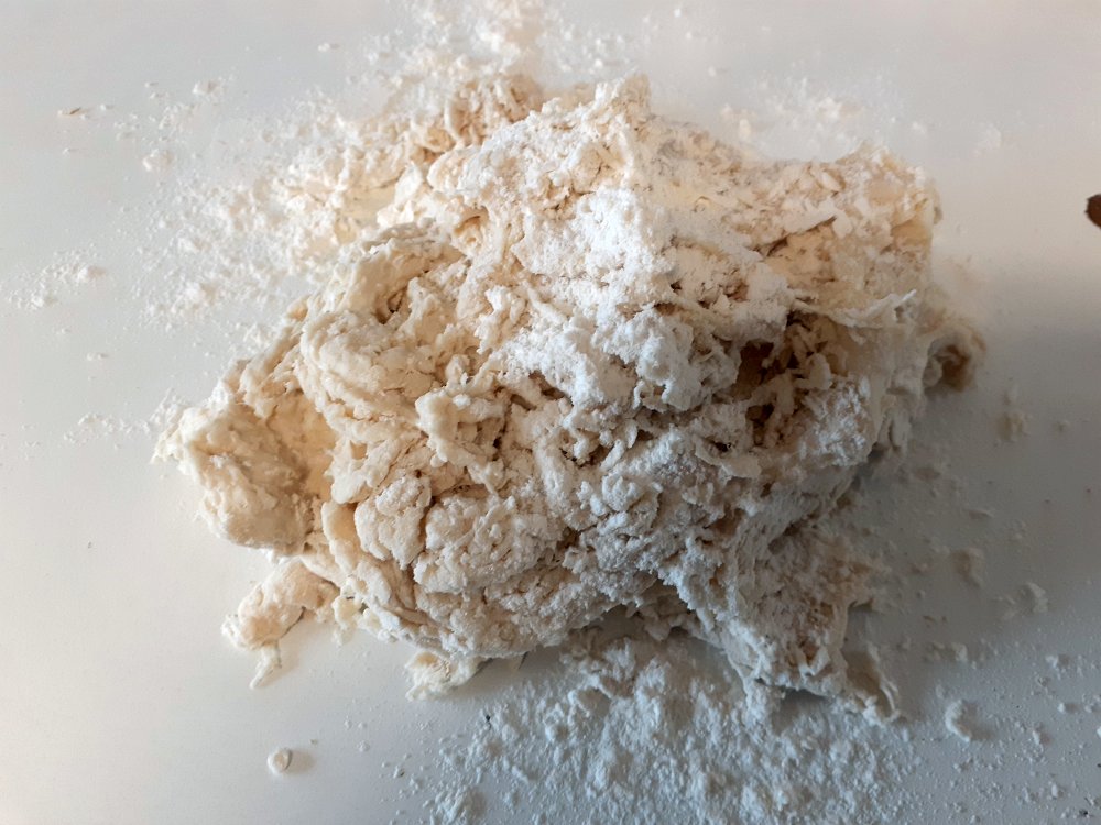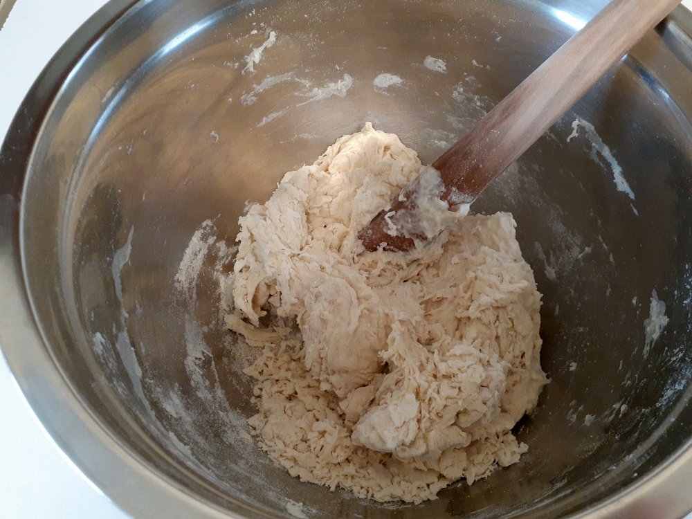 I normally mix the dough in a bowl with a wooden spatula but have done the job straight on the bench top and using my bare hands, a messy business.